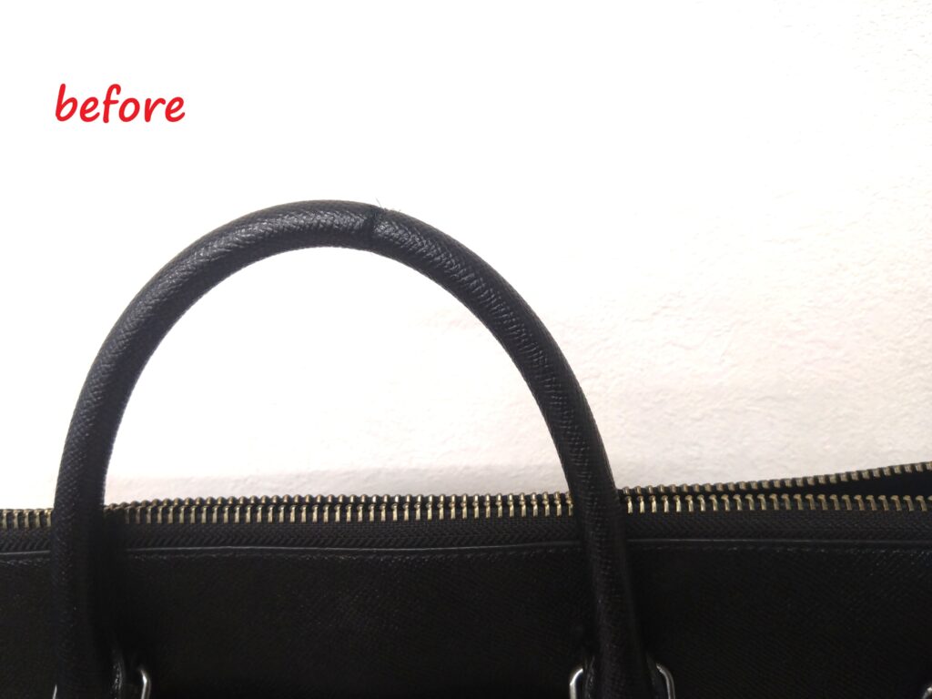 持ち手の革が切れかけている状態およびスレ傷と少しひび割れがありましたのでレザーリペア補修ではなく持ち手を新しく交換修理のご提案させていただき、持ち手交換のご依頼をいただきました。