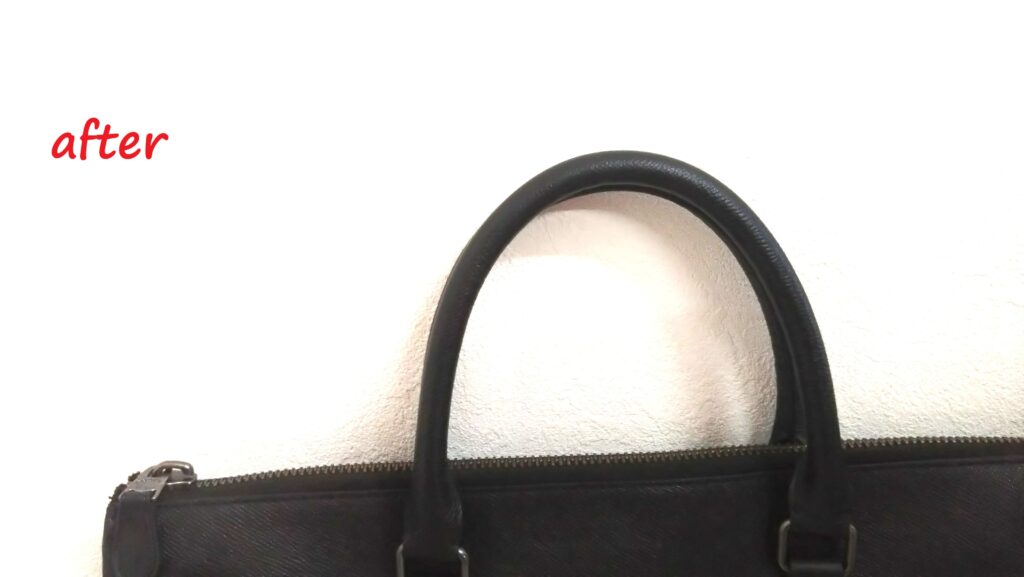初めてビジネスバッグを拝見した時、片方の持ち手はお問合せの通り持ち手の革が切れかけていました。もう片方の持ち手は写真では分かりにくいですが、スレ傷があり少しひび割れている所もありました。