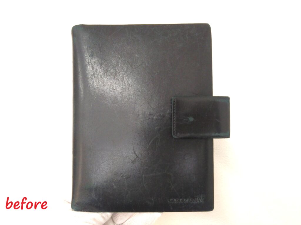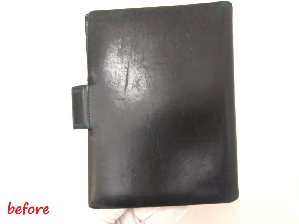 お客様から手帳カバーの傷と色落ちが気になるので修理をお願いしたいとお問合せ及びご依頼をいただきました。
