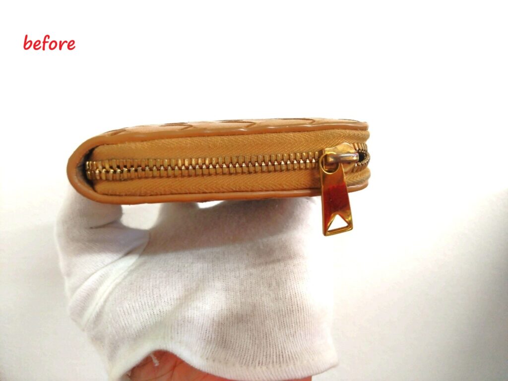 財布を初めて拝見した時、色褪せとスレ傷、ファスナーのスライダーが経年劣化しファスナーが閉まらなくなっていました。