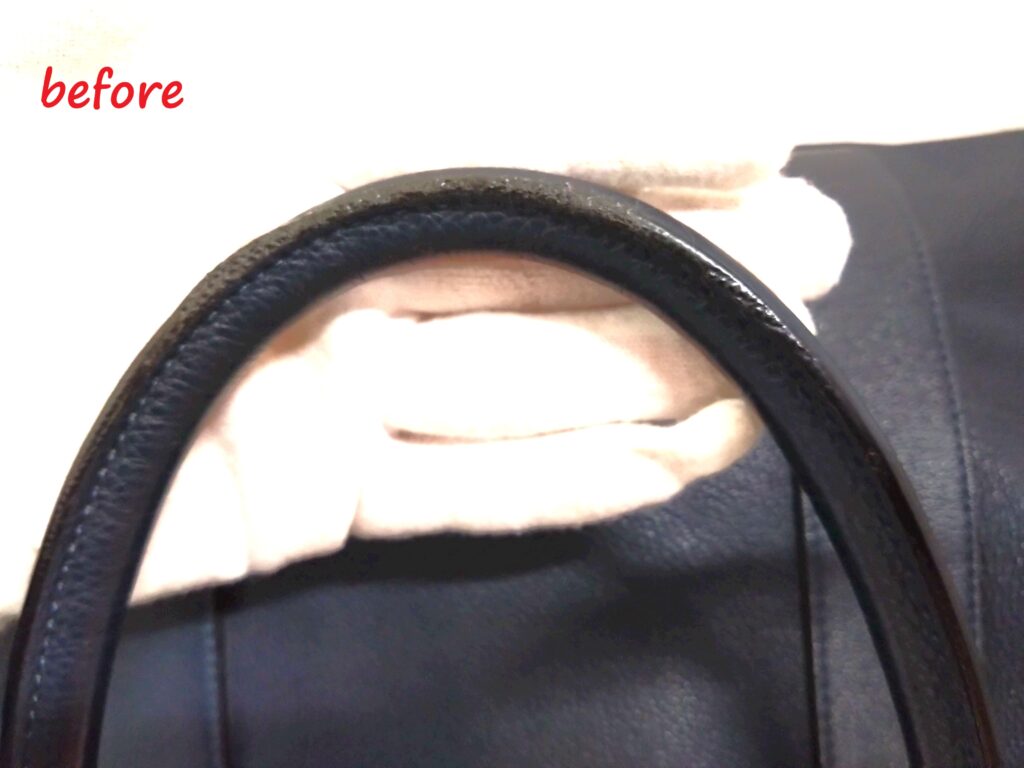 お客様からサヴィル ビジネス トートバッグの持ち手のコバが劣化しベタついているので修理をしてほしいとお問合せ・ご依頼をいただきました。