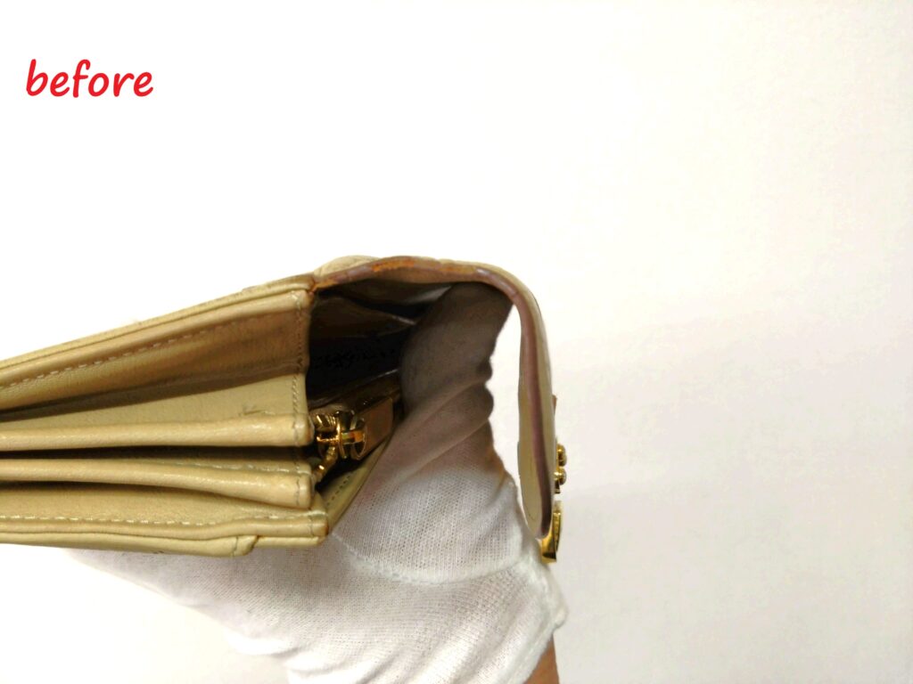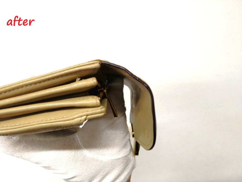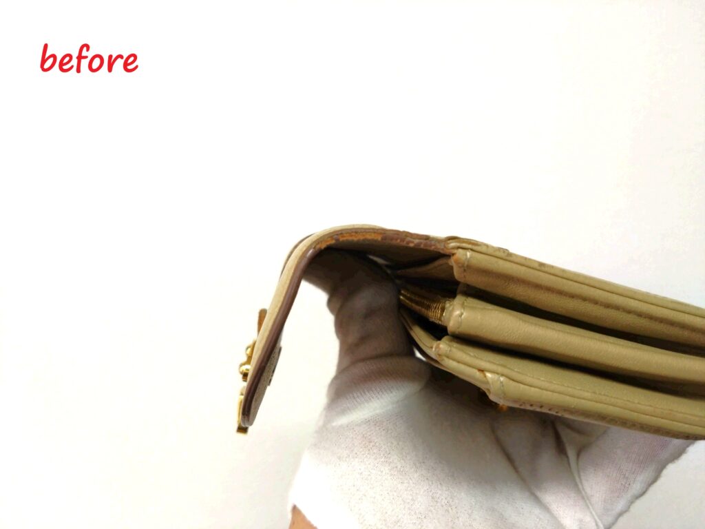 財布を初めて拝見した際、部分的に汚れが目立つ部分があります。また、財布のコバがはがれていました。