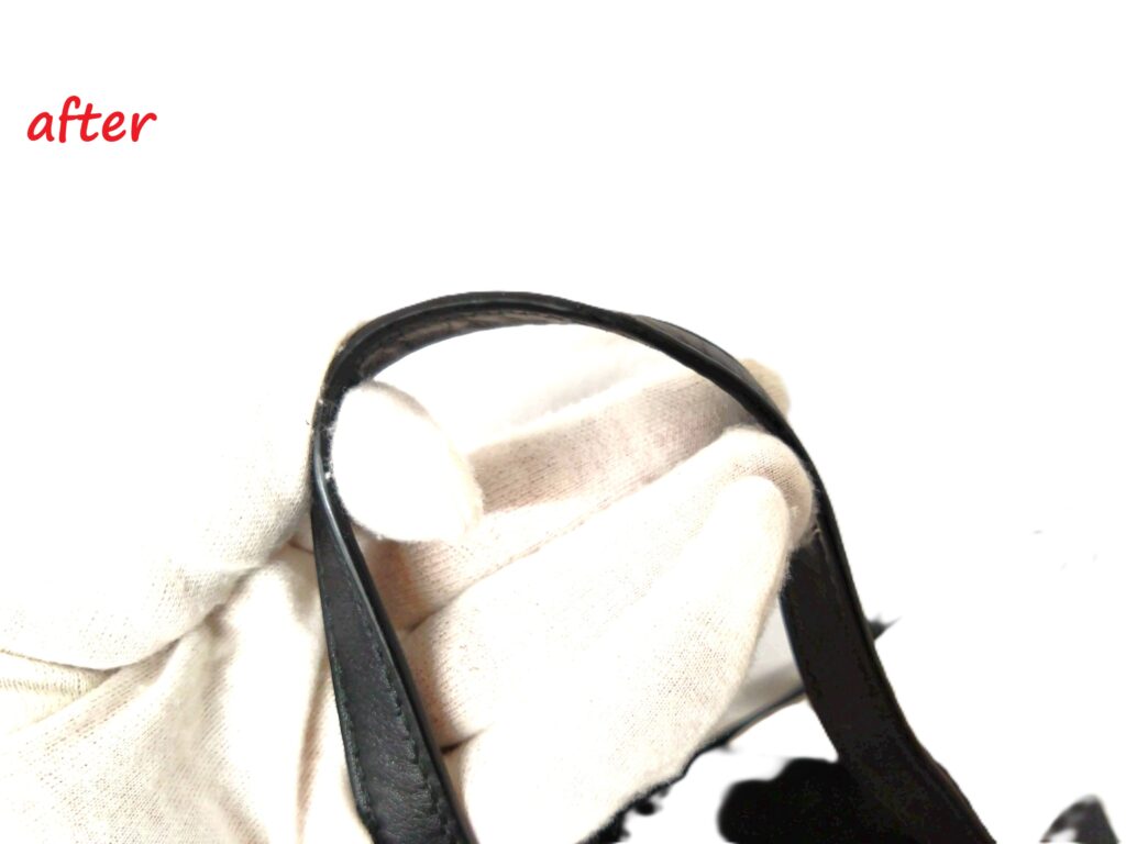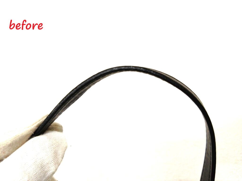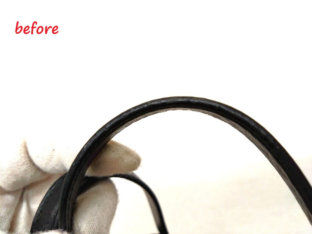 バッグを初めて拝見した時、バッグに縦方向に2本スレ傷がありました。また、持ち手のコバも剥がれてきてベタついていましたのでスレ傷の部分補修と持ち手のコバ再生施工をご提案させていただき、ご依頼をいただきました。。