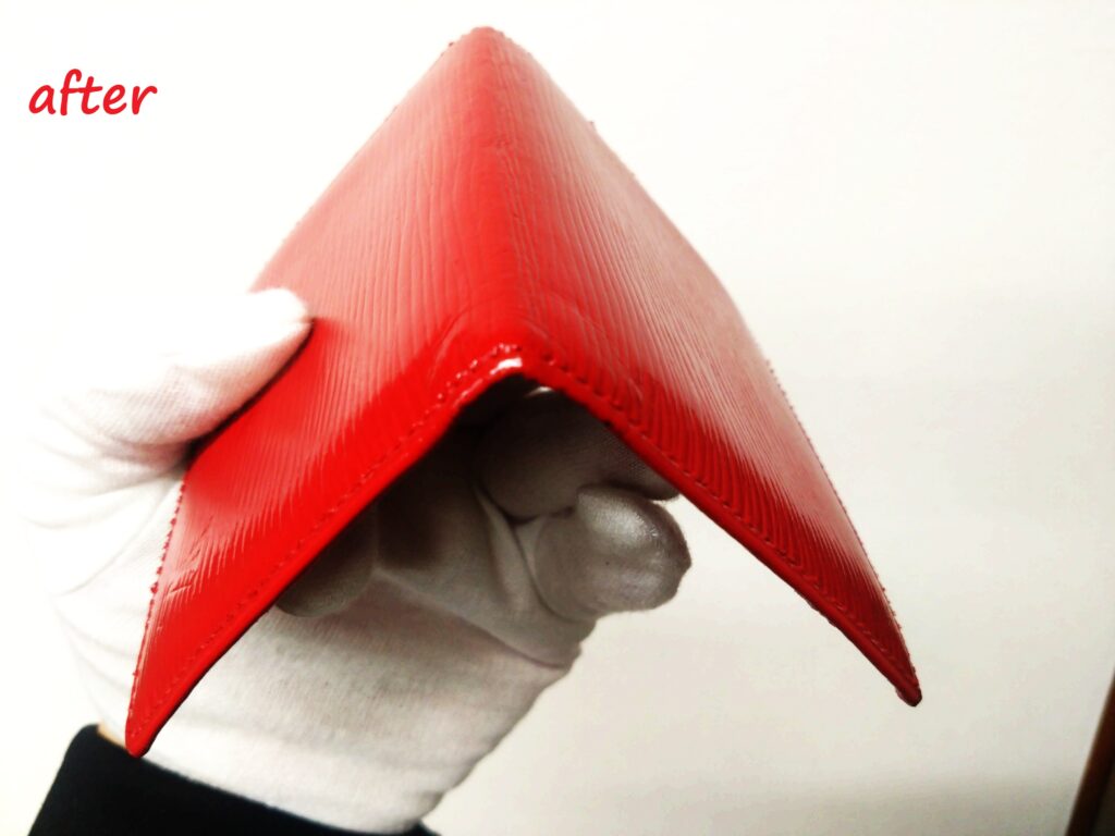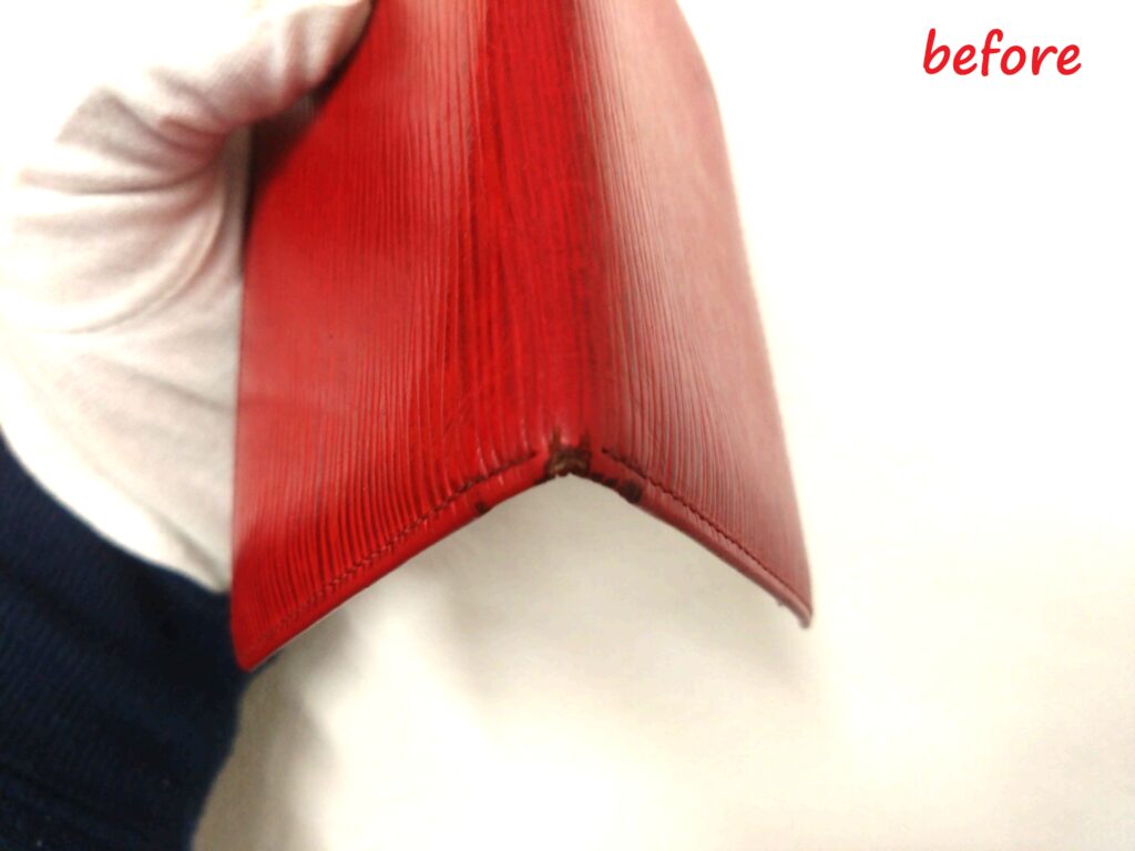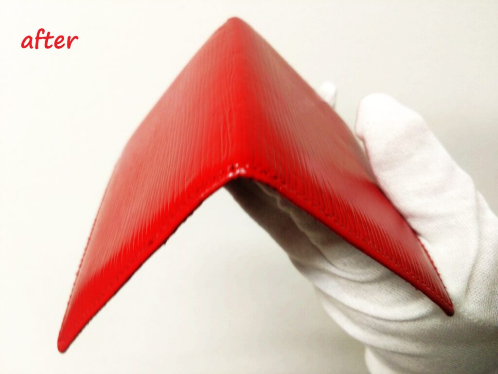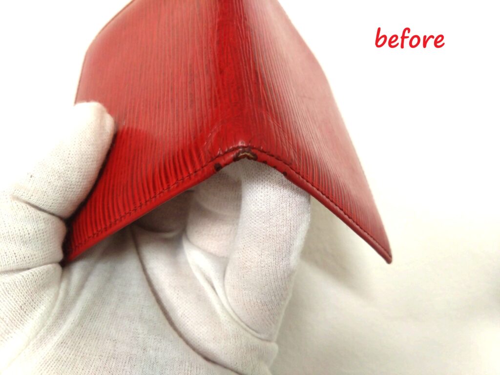 角にスレ傷があり、革が捲れていましたが、綺麗になりました