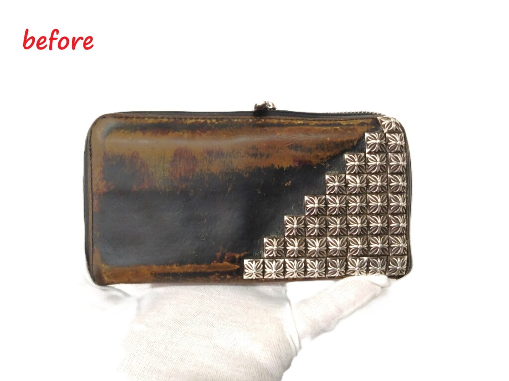 財布修理 クロムハーツ REC F ZIP ゼロピラミッドスタッズウォレット スライダー交換 ひび割れ補修 染め直し修理