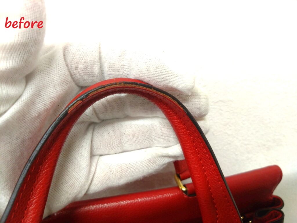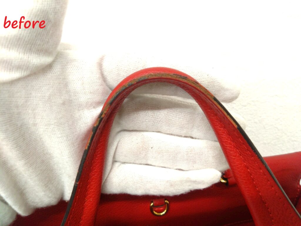 ハンドバッグを初めて拝見した際、ハンドバッグの持ち手とバッグの側面のコバが剥がれている状態でした。