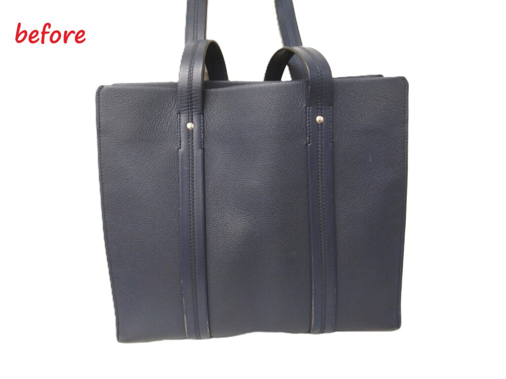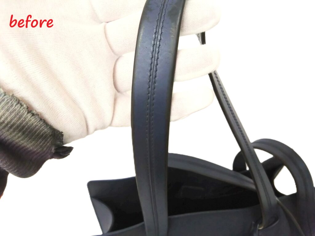 初めてバッグを拝見した時、トートバッグの持ち手の革が捲れとトートバッグの底の四隅にスレ傷がある状態でした。