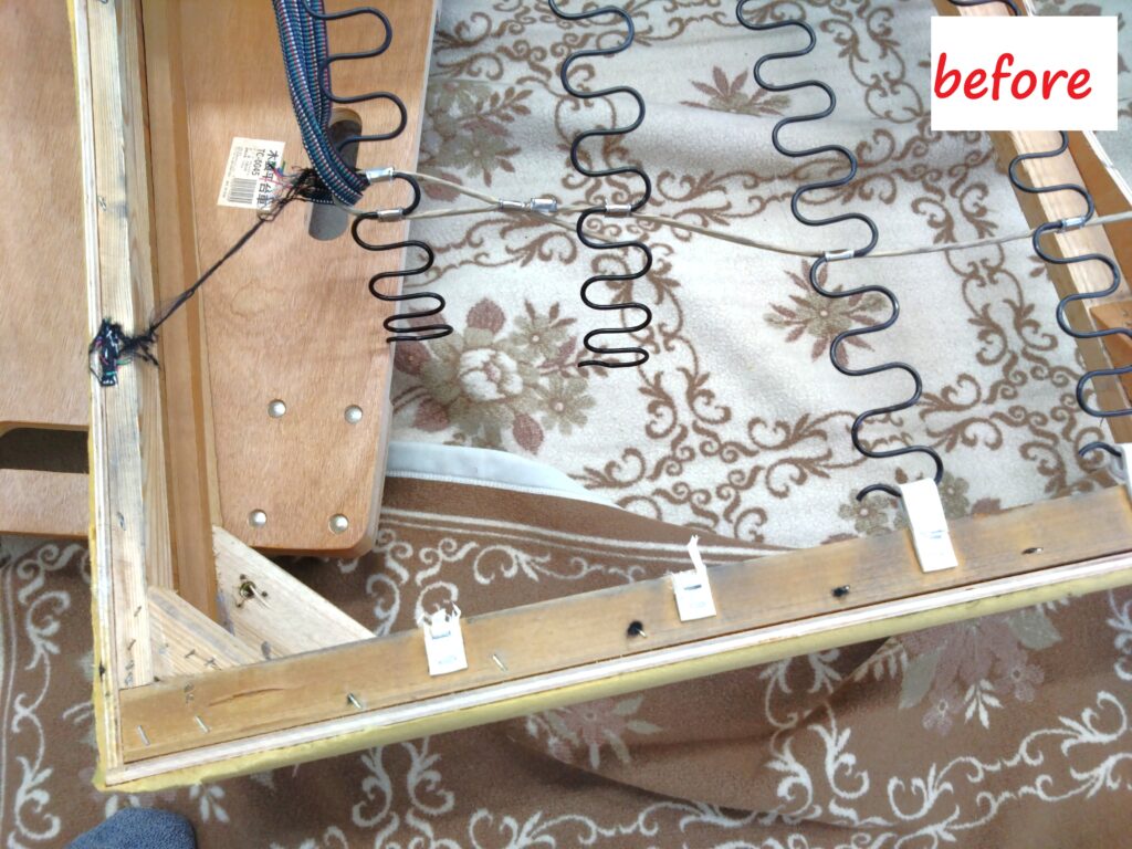 裏張りとファブリックカバーを取り外したことで、Sバネ(スプリング)の状態が確認できます。