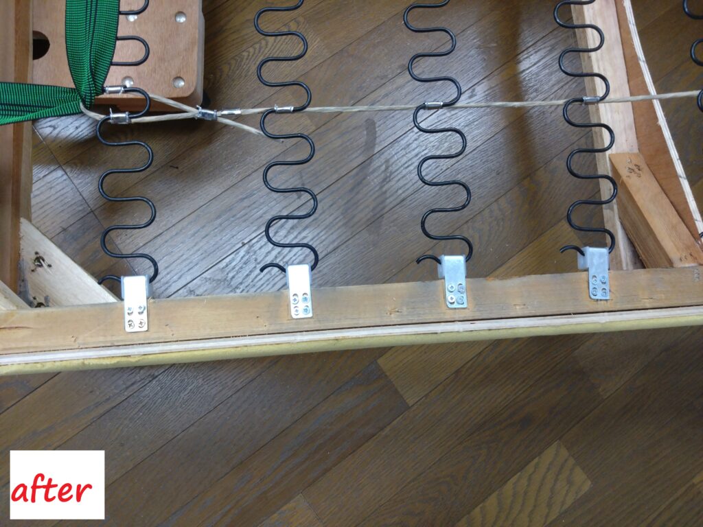 裏張り、ウレタンを外してSバネの状態を確認した際、左から2つのSバネの固定具は破断、左から3つ目と4つ目の固定具は破断しかけていました。