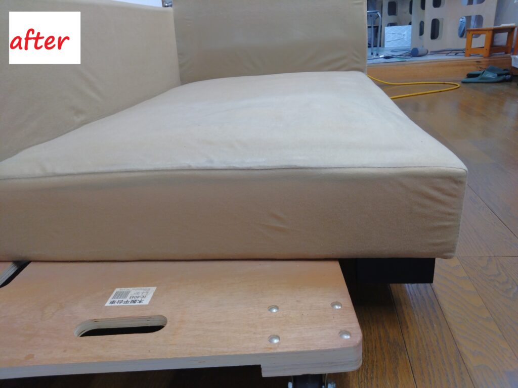 新しいソファ底の裏張りをエアータッカーを使用し取付けて、完成です!(^^)!