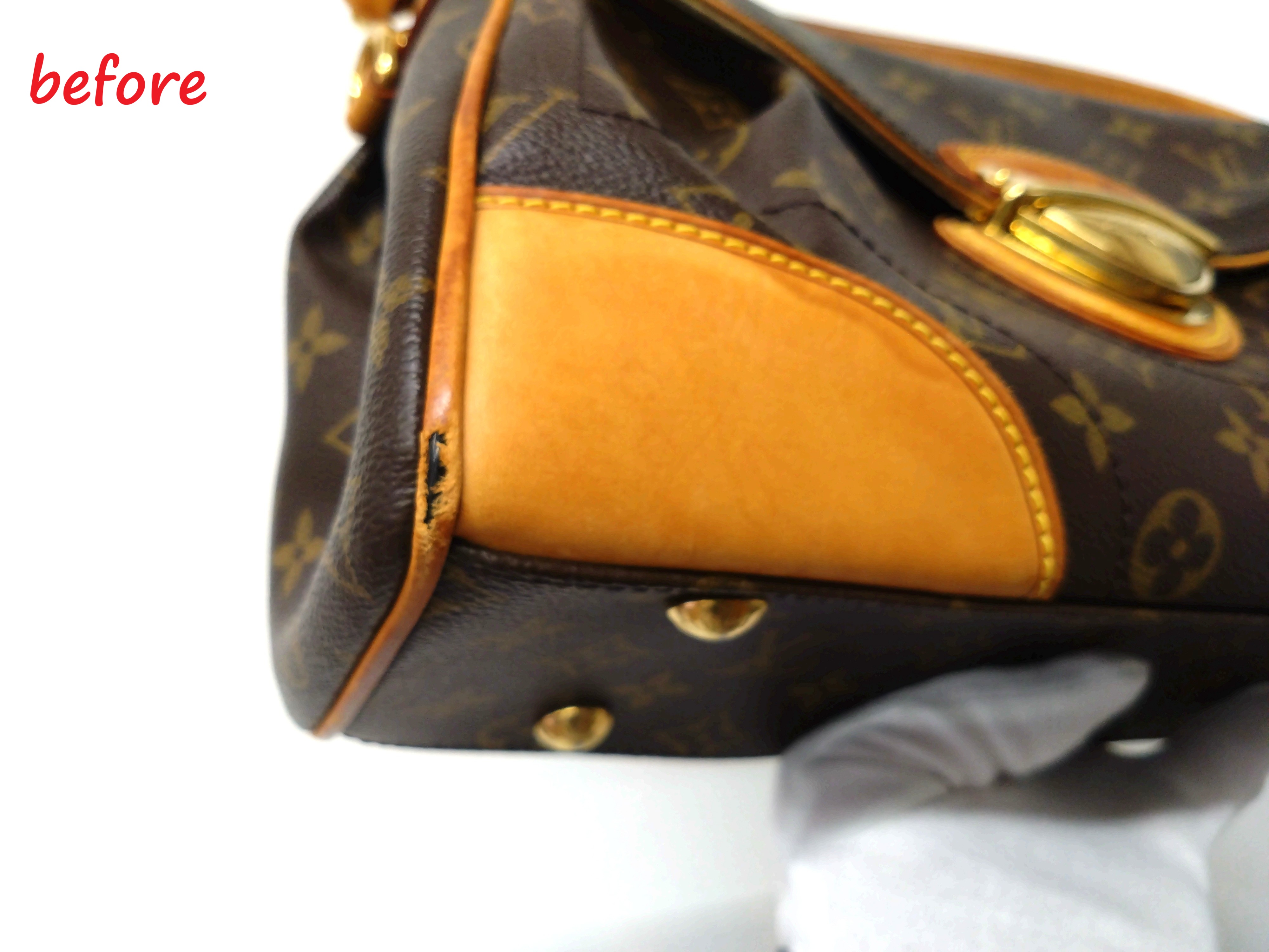 Louis Vuitton モノグラム キャンパス ビバリーMMショルダーバッグ 革の破れをキレイに修理できました。